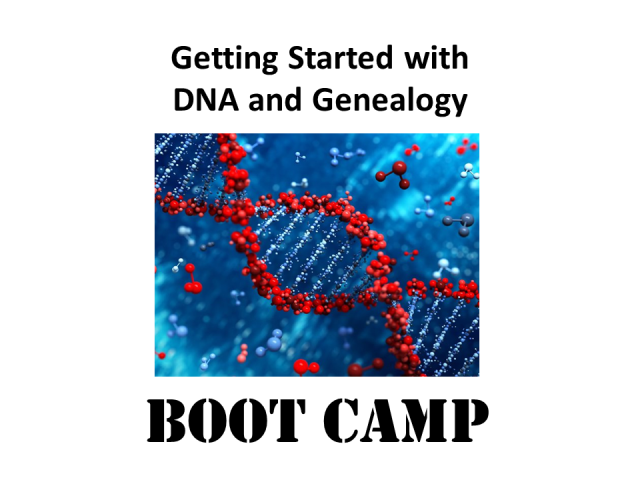 Join us for “DNA Boot Camp” sessions. We are using the recorded webinar series “DNA Boot Camp” by Thomas MacEntee featuring DNA expert Mary Eberle of DNA Hunters, LLC. The boot camp includes handouts with powerful DNA educational materials.