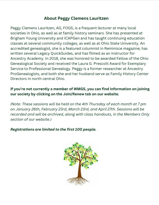 Genealogy 101, a 4-session online course with accredited genealogist Peggy Clemens Lauritzen in 2023. These sessions were recorded and are now available exclusively to WMGS Members.